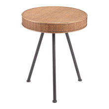 This fun side table has a powder coated steel frame with a wood and rattan top, which works in any space, boho chic or modern industrial.