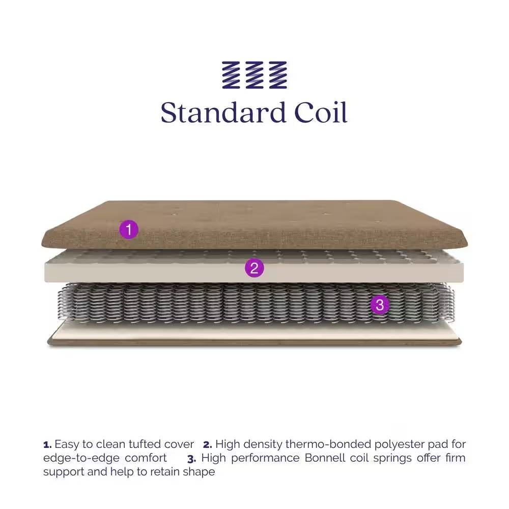 • Composed of a 12 gauge 264-count steel bonnell coil innerspring base, the comfort layer is made from thermobonded high-density polyester fibers, and the cover features soft microfiber fabrication with tufting that helps retain mattress shape