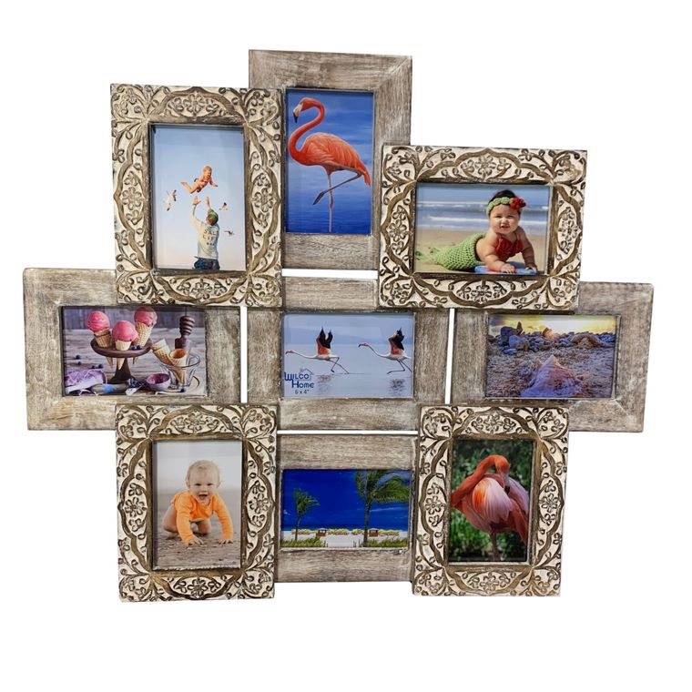 The Generations hand-carved mango wood 9 photo frame wall collage is a stunning piece of art that seamlessly combines functionality and aesthetics. This beautiful collage features nine frames, with four of them intricately carved in a delicate floral pattern that adds a touch of elegance and sophistication to the piece. Each frame is finished with a whitewashed effect that gives it a distinct and unique look.