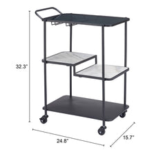 The 25-inch black steel and glass rolling bar cart is a stylish addition to any home. Crafted from durable steel, this cart ensures stability while showcasing a sleek black finish that complements its contemporary design. The rectangular translucent black glass top and faux marble middle shelves add a touch of elegance, perfect for displaying your favorite beverages and accessories. Designed with practicality in mind, the included wheels make it easy to move the cart from room to room or to serve guests effortlessly. Its modern aesthetic and chic black color make it an ideal choice for entertaining or adding flair to your living space. This bar cart is not just functional but also a statement piece that enhances your home decor. 32.30-inch h x 25.00-inch w x 16.00-inch d.
