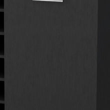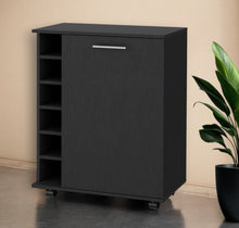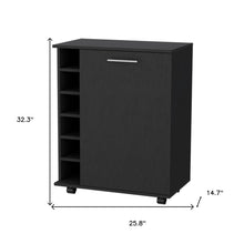 Add a touch of sophistication to your home with our black rolling bar cart with wine storage. Crafted with a modern style, this bar cart features a sturdy frame and top made of manufactured wood. Its rectangular shape provides ample space for storing your favorite spirits and glassware. Equipped with cabinets and wheels, this cart offers both convenience and functionality. The elegant black color adds a sleek and stylish look to any room. Not only does it hold up to 6 wine bottles, but it also serves as a statement piece for entertaining guests. Upgrade your home decor with this versatile bar cart that combines both practicality and elegance. 32.3-inch H x 25.8-inch W x 14.7-inch D