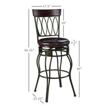 The elegance and unique style of this 30"bar stool will carry throughout your kitchen, dining, or home pub area. Crafted of metal and highlighted with subtle curves and a distinctive four oval back, this stool is a positively striking addition to your home. The cushion is piled high for extra comfort, and the chocolate wipe clean faux leather seat is pliable and resistant to everyday wear and tear, making this stool versatile for any gathering area. 275 Pound weight limit