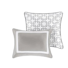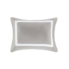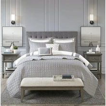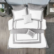 Create the perfect look in your bedroom with the Madison Park Heritage 8 Piece Comforter and Coverlet Set Collection. This hotel bedding collection features a grey and white comforter and coverlet that both come with matching shams for a simple, yet luxurious look. The soft comforter and shams showcase a bold grey border on a white ground with a solid white reverse, while the coverlet and its shams display a window pane end-to-end quilting pattern. Two decorative pillows, one square and one oblong with embroidered and pieced details provide the perfect finishing touches to this 8 piece bedding set. Great for year-round use, this comforter and coverlet set collection provides exceptional warmth, comfort, and style to your bedroom décor.