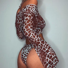 Long Sleeve Mesh Bikini Swimwear Women Three Pieces Leopard Swimsuit Female Summer Bathing Suit Brazilian 3 Pieces Set Knot Front Off Shoulder Cover Up with Halter Bikini Sets Bathing Suit