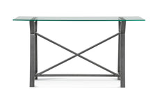 The Ross Console Table features a metal X cross base design. Finish: hand-brushed pewter. Material: powder coated steel, clear glass. Adjustable floor levelers. COO: Vietnam.