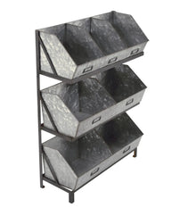 This industrial wooden bin display features 3 tiers and 7 bins and is perfect for organizing miscellaneous items. The various bins feature ample space to organize, display and store socks, bath bombs, accessories, gifts and more! Each shelf can be removed and put on a different level creating different storage or shelf options. Each bin also features a slot which can hold a label. Stores can place this item on a tabletop offering a great visual that is easy for customers to reach. Not food safe.