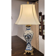 This classic Chinoiserie style vase lamp is made from porcelain and hand painted in a blue and white classic design. With a bronze base and accents. Topped with a beige white tapered shade.