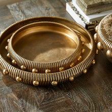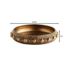 The Batten collection leaves an indelible mark through intricate design and meticulous detail. This large-scale cast aluminum tray bears an antique brass finish that accentuates the crevices of its vertical ribbed texture. A polished brass-finished button detail provides a striking contrast, creating an exquisite focal point. The Batten collection of statement pieces serve as a functional yet remarkable accent to any design.