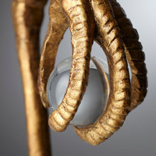 A long-legged ibis is the stunning centerpiece of this decorative table lamp. Beautiful in any space, this lamp features a warm ancient gold finish over detailed resin construction. A black satin drum shade is lined in gold, ensuring inviting illumination for a favorite sitting area. This charming bird holds a crystal sphere in its talon, and rests on a acrylic base that delivers a touch of luxurious flair.