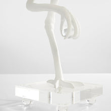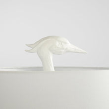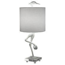 A long-legged ibis is the stunning centerpiece of this decorative table lamp. Beautiful in any space, this lamp features a white finish over detailed resin construction. A white, silver-lined drum shade creates an inviting illumination for a favorite sitting area. This charming bird holds a crystal sphere in its talon and rests on an acrylic base that delivers a touch of luxurious flair. Place on a side table in a living room or atop an office desk for an added touch of whimsy.