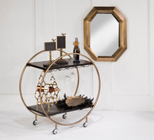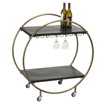 This Bar Cart is perfect for entertaining or catering events. The cart features a round gold painted metal frame and brackets that hold 25 wine glasses. The two matte black wood shelves are 20.5 inches apart and hold up to 17.5 lbs. The cart is complete with locking casters to ensure cart stability. Follow simple instructions for assembly.
