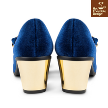 Shimmery blue velvet upper fabric with golden heel and trapeze artist accessories on gold tone chains. Synthetic rubber sole. Accessories are permanent, not removable.