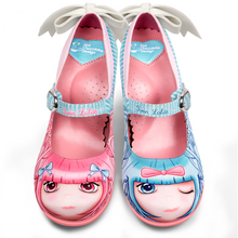 These perfect pink and blue sweeties feature our adorable Lolita Twins on the toes, along with true dolly style in the form of removeable bows and old school wind-up toy key detail on the 2 inch heel. We just love a reboot (this style is an OG from the first ever collection of Double Topping heels!), and this is one we've been longing for!