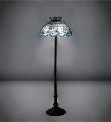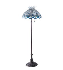 Grace your home with this elegant floor lamp. A crowned shade with a gridwork of Winter-kissed Icy Clear Fern Glass is adorned with a Wedgewood Blue colored border of swirling ribbons and perfect Blue rosebuds accented with Green Leaf accents. The Tiffany style stained glass shade is made of hand cut and copperfoiled glass. The shade is embraced by a floor base finished in Mahogany Bronze. Beautiful illumination emanates this resplendent Roseborder shade which is created using the famous Meyda Tiffany copperfoil construction. UL and cUL listed for dry location.