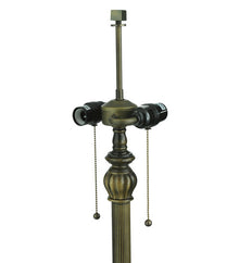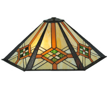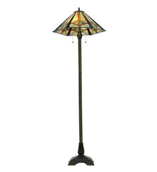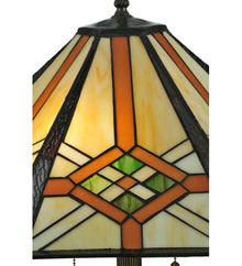 This lamp shade; inspired by the clean geometric lines of the mission style; has diamonds and raised bands of Root Beer granite glass on panels of Bone Beige and Moss Green. Hand cut pieces of glass are wrapped in copperfoil and soldered together in the Tiffany tradition to make this handsome shade. The hexagonal shaped shade is supported by a 2 light mission styled; footed floor base; hand finished in Dark Bronze. "