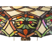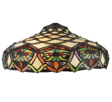 A luxurious Art Nouveau stained glass shade is highlighted with Sunburst and Amber jewels that accent a Sunset Orange; Amber; Leafy Green and Blue/Green patterns; with borders featuring swirled Blue/Green/Purple colored pieces of glass. The stained glass shade is handcrafted using Meyda Tiffany's world famous copperfoil construction process. This magnificent Tiffany styled art glass shade is complemented with a floor base hand finished in a warm Mahogany Bronze.