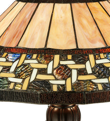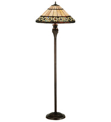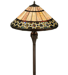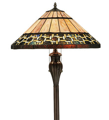 Named for the Greek word for light; Ilona will stir conversations among family and friends with a dramatic Honey and Beige colored knotwork design on Wispy Blue/Green Rippled glass. The lamp shade's background includes Beige; Mauve and Purple art glass while Root Beer colored glass borders enhance the beauty of this exquisite art glass shade; which is created using Meyda Tiffany's famous copperfoil construction process. The floor base is finished in a warm Mahogany Bronze.