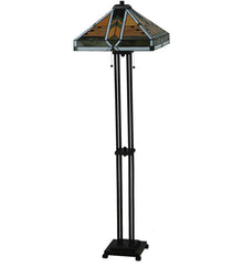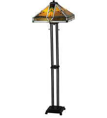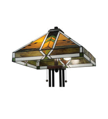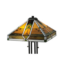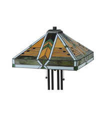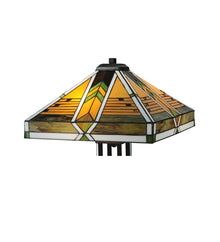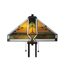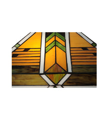 Offering a unique and handsome Mission design; Abilene uses colorful arrowheads of Honey; Woodsy Green and Bark Brown on a multi-designed motif of linear locks of Green; Bark Brown and Amber. The handcrafted stained glass shades; which feature a Mission design that interprets organic objects into geometric forms; are framed in White with Woodsy Green glass and was created using Meyda Tiffany's famous copperfoil construction process. The shade is complemented with Mahogany Bronze finished four-column base.