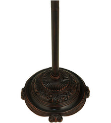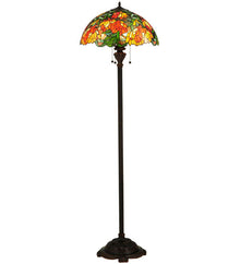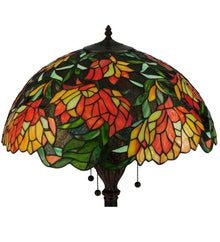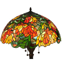 In all its natural beauty; a bouquet of blossoming flowers in Peach; Tangerine and Yellow hues bloom while surrounded by radiant Willow Green leaves and glistening Multicolored Rippled glass. This lamp is so beautiful that you will think you are sitting in an English Garden. This stunning Tiffany styled stained glass shade; with a coordinating floor base in a warm Mahogany Bronze finish; will add a brilliant; luxurious elegance to your home.