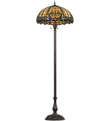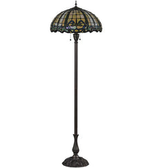 The Tiffany Dragonfly re-creates Tiffany Studio's most beloved designs in all of its splendor. A Dragonfly flies and dives downward with glowing Golden Yellow jeweled eyes; a Sky Blue tail and delicate Blue; Yellow and Green wings over hand-cut and copperfoiled pieces of a Green and Blue scroll-like border. The Beige Iridescent glass background is separated by White swirled glass pieces and accented with Goldenglass jewels. The shade is created with Meyda Tiffany?s famous copperfoil construction process and complemented with a Mahogany Bronze finished floor base.