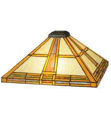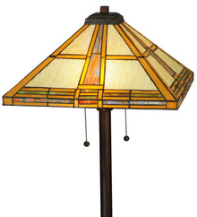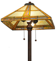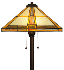 This stunning Mission style lamp features a geometric pyramid-shaped shade with straight line designs in Golden Yellow and Beige art glass; which is bordered with a handsome blend of Multicolored grid border featuring Blue/Green; Red and Amber. The shade was created with authentic stained glass using Meyda Tiffany's famous copperfoil construction process and is complemented with a four-legged floor base finished in Mahogany Bronze.
