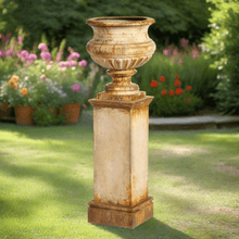 Every detail of this antique-style iron garden urn with tall pedestal speaks to heritage craftsmanship. The patina, mottled in warm ochres, deep bronze, and sun-faded gold, feels as though it has been touched by decades of changing seasons. You can almost hear the quiet trickle of a nearby fountain and the crunch of gravel paths underfoot, the scene lit by the amber glow of the late afternoon sun. The urn planter and pedestal can be used together for a commanding statement or separately for versatile styling — perhaps the pedestal displaying a beloved sculpture, while the urn overflows with trailing ivy or seasonal blooms.