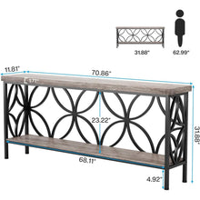 This Modern 70-inch Long Narrow Foyer Entryway Table with Grey Wood Top and Shelf features a vintage wood grain surface combined with black metal accents, creating an enduring pastoral look. The unique, artistic metal frame in the backdrop offers a contemporary yet artistic touch. This console table is as functional as it is stylish and can be seamlessly incorporated into your home decor. Whether used as a sofa table behind the couch for an enhanced seating area or as an entryway console table for captivating displays, it delivers an exceptional experience. Measuring 70.9"L × 11.8"W × 31.9"H, this elongated console table fits perfectly in narrow spots such as entryways or hallways. The 2-tier open shelf design offers plenty of room for display and storage without consuming much floor space. Made from high-quality particle board and steel, this slim console table boasts exceptional stability and longevity, with each shelf capable of holding up to 198 pounds. The adjustable foot pads are designed to accommodate uneven floors and prevent scratches. This entryway console table comes with detailed assembly instructions. All parts, tools, and instructions are included. We also offer an 18-month quality guarantee and lifetime professional customer service. Should you have any queries, feel free to reach out to us.