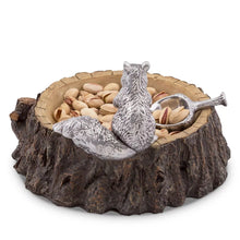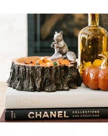 • An exquisite, aluminum squirrel balances on the edge of a stump-like bowl as he watches over his treasured collection of nuts