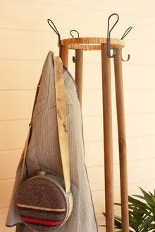 Organization meets style with this tall rattan coat rack, which features an umbrella basket. This is a great choice for an entryway, bathroom, or mudroom.