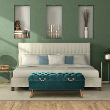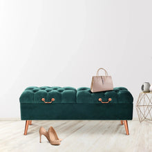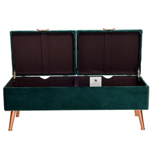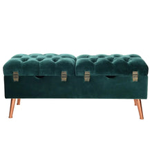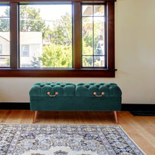 Tuffed Velvet Storage Trunk! This emerald colored trunk will dazzle with its gold handles and legs made to make this piece pop. Use the two storage compartments for holding magazines, books, or blankets. Place in an entry way, bedroom, or living room. This piece will wow you and your guests.