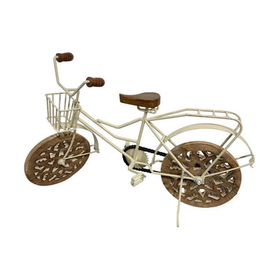 "Daisy Duke" Metal Bicycle Table Decor. Beige Metal with Mango Wood Wheels, Seat and Handle Grips.