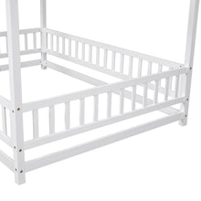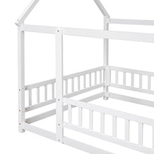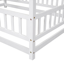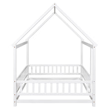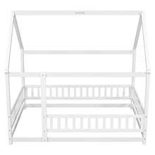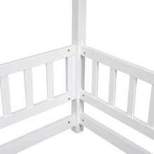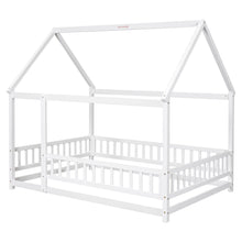 Full Size Floor Wooden Bed with House Roof Frame, Fence Guardrails ,White