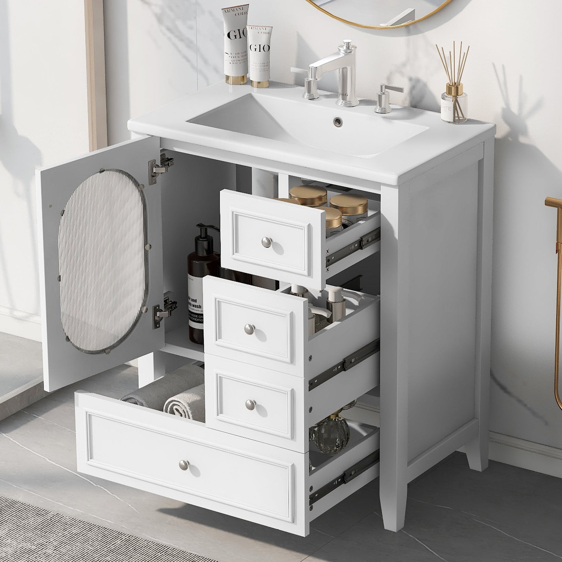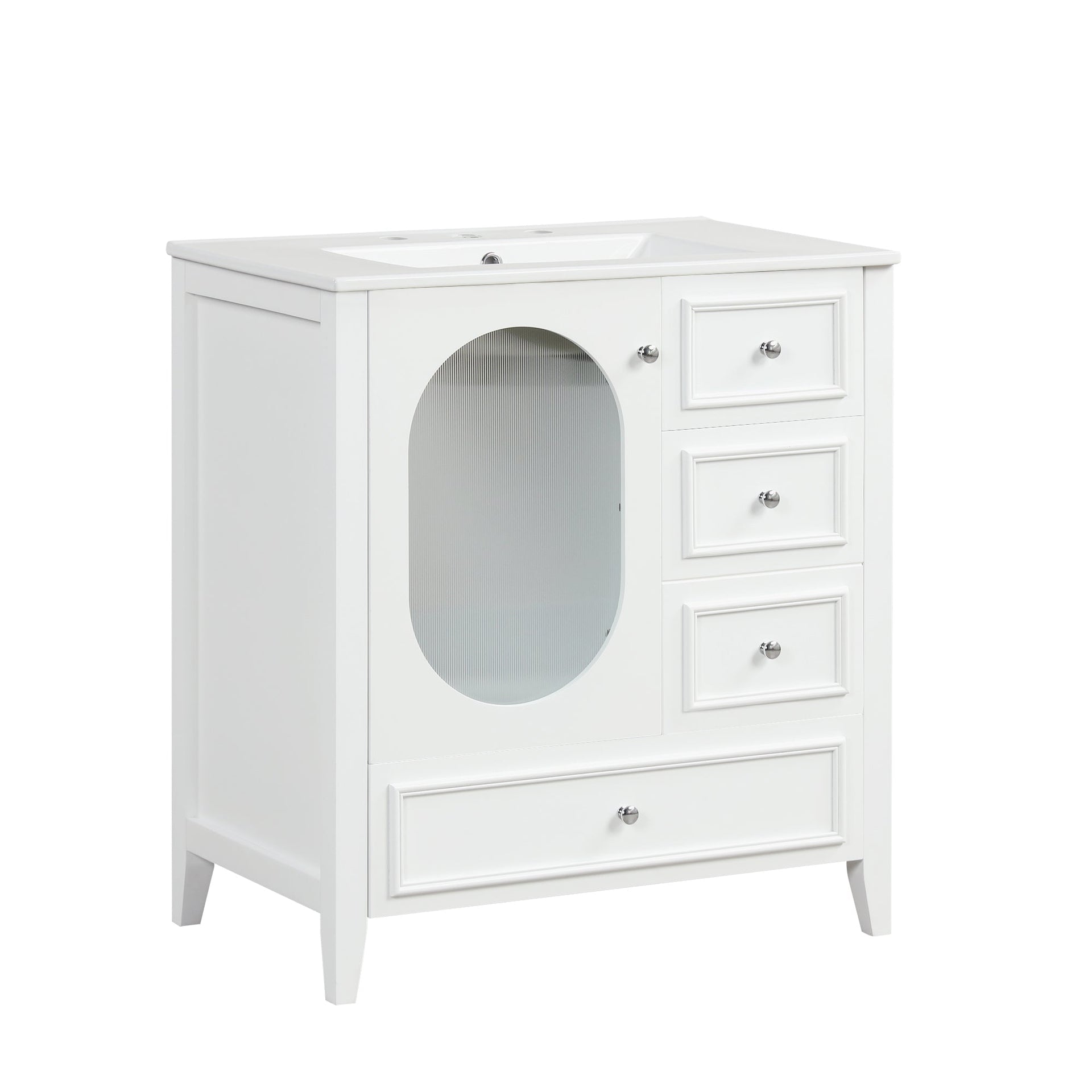 1. 30" Bathroom Vanity with Sink 2. Solid Wood & High-quality MDF Board & Ceramic Sink & Moru Glass & Painted Finish 3. Cabinet with Door & Three Drawers 4. One Package Details 1. Three Drawers with Slides 2. Silver Metal Knobs 3. Stainless Steel Hinges