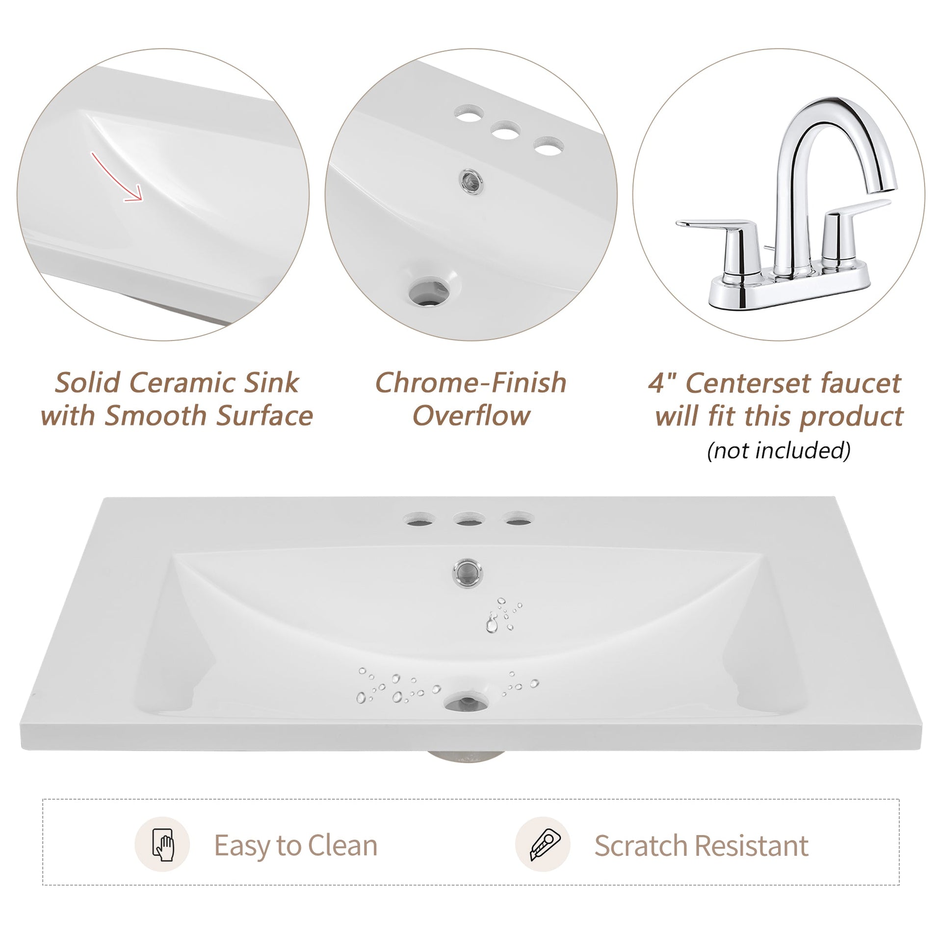 30" Single Bathroom Vanity Top with White Basin 3-Faucet Holes Ceramic White
