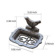 Rustic cast iron soap dish featuring a decorative bird accent and open drainage tray to keep soap dry. Durable and vintage-inspired, perfect for farmhouse bathrooms, kitchens, or garden sinks.