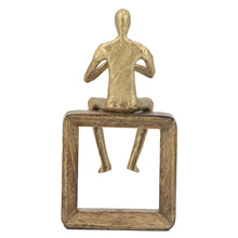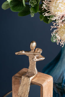 - Abstract musician figurine crafted from aluminum on a solid mango wood base with a natural finish.