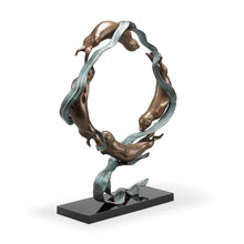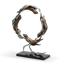 A playful sculpture designed with grace and style, this Sea Otters Spectacle Sculpture from San Pacific International features 4 Sea Otters swimming in a circle. One look at this organic, contemporary piece turns every animal lover into a smiling child again. Brighten any room with playful natural charm. Brass sculpture on a marble base.