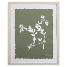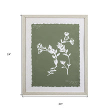 This casually elegant Moss Green and White Botanical Flowers print is a beautiful way to decorate most any room. Unique and beautiful, this print has rough trim deckled edges and is mounted on a speckled white mat board. Framed under glass in natural wood tone finish molding, this simple botanical is a great choice. 24" x 20" x 1".