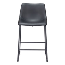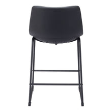 This counter stool's seat and back are built with a sculpted design for comfort. It's upholstered in a soft 100% Polyurethane fabric, with a slim profile metal base and two crossbars for stability. The frame is finished in matte black, for a universal appeal.