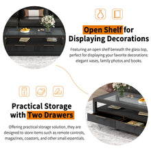 A perfect blend of contemporary design and practical functionality, our sleek coffee table is an epitome of modern furniture craftsmanship. It designed with transparent tempered glass top, open shelf, storage drawers, and natural grain finish to complement a variety of interior styles, providing both aesthetic appeal and practical storage solutions. Whether you're entertaining guests or enjoying a quiet evening at home, this coffee table will serve as a central piece that enhances the beauty and organization of your living space.