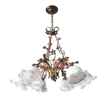 This Belle Fleur Brass Chandelier, crafted from brass, glass, and ceramic, is a testament to superb craftsmanship. The brass body features an elegant design and rose embellishments, while the glass shade adds a touch of lightness and refinement to the overall effect.