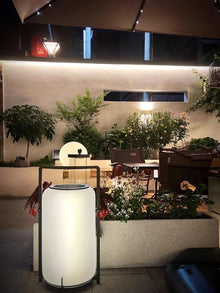 It is a deliberately precious but essential light; the shade is in white blown glass finely engraved by hand. The structure is in stainless steel, perfect for outdoor use, and highly resistant to atmospheric agents. It will turn off at dawn.