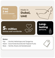 • Heart Notes: A harmonious blend of gourmand accord, tropical fruits, rose, and coffee creates a captivating middle note that is both sweet and comforting.