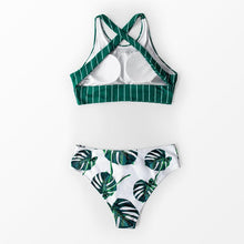 Green Stripe And Leaves Print Bikini Sets Women Tank Swimsuit Women's Two Piece High Neck Bikinis Swimsuits Modest Crop Top Bathing Suits For Teens Two Pieces Girls Beach Bathing Suits Swimwear
