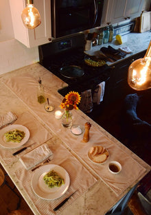 Pair this Farmhouse Ticking Stripe Yarn Dyed Table Runner with our matching Tablecloth, Napkin Set, Chair Pads and/or Placemats for a complete and coordinated look. These items make excellent housewarming gifts for anyone moving into their first apartment or any new home.
