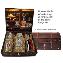 This 25-ounce glass decanter is embellished with a fine pewter casting matched with two Double Old Fashioned Glasses. The glassware is securely placed in an antique Chest Box. A great addition to any home bar! Made in USA.