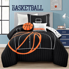 After your star youth basketball player gives it all they have on the basketball court, your child will need a cozy place to rest their head and recoup their energy for the next big game. Look no further than this bold Basketball Game Quilt Set. This fun and exciting basketball themed quilt set is designed with the youth basketball player (or super fan) in mind. ?áThe bold print is perfect for true fans of the game, or general sports-inspired bedroom themes. The front of this reversible bedding set features a much bolder basketball court graphic, while the reverse has a more subtle look of basketballs and backboards. The shams are also reversible. This unique bedding set includes a soft reversible quilt, matching pillow shams (1 sham for twin, 2 shams for full/queen), and 2 decorative throw pillows. The two decorative pillows feature coordinating designs, one with the motivational mantra "Eat. Sleep. Basketball.", and another shaped like a basketball, adding a playful and inspiring touch to the room. This reversible microfiber bedding set offers softness and breathability. The polyfill is perfect for hot sleepers and great as an extra layer for those cold sleepers who layer-up to keep warm. This product is STANDARD 100 by OEKO-TEX?« certified, which means the fabric, dyes and all components have been tested in an independent laboratory and certified against a list of more than 350 harmful substances. To care for this bedding set, simply machine wash cold on gentle cycle and tumble dry low. If needed, use non-chlorine bleach or use an iron on low heat to release wrinkles. The decorative pillows should be spot cleaned. Please refer to the product labels for full care instructions. Complete this graphic basketball look with the coordinating pieces in the collection.