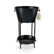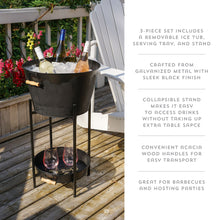 Perfect for parties, this ice bucket and tray set comes with a matching collapsible stand. Made from galvanized metal with a powder coated black finish and wooden handles, the tub and tray are removable and ideal for serving drinks or chilling wine.