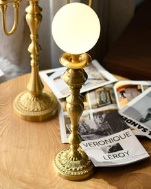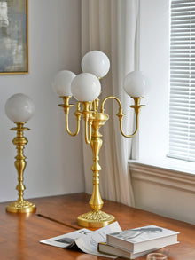Crafted in brass, this candelabra table light is the perfect centerpiece for indoor gatherings. Three of its arms curl outwards from its sides, while the fourth straight arm stems upwards...