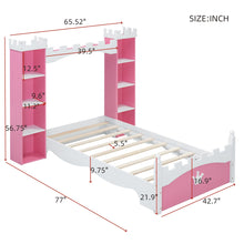 Twin Size Castle Wooden Bed with Bookcase for Kids Bedroom, Pink+White